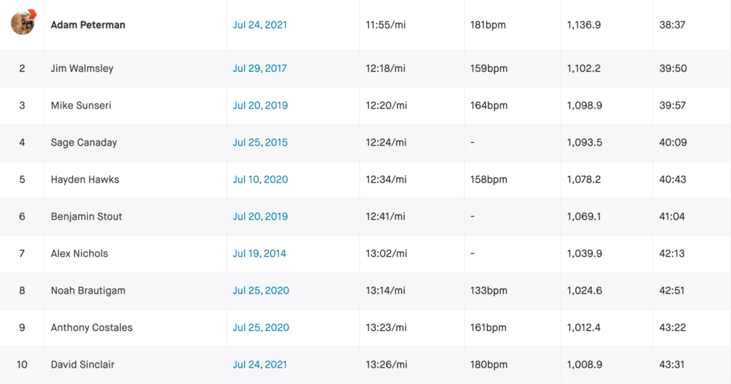 He crushed it! Ran it a minute and thirteen seconds faster than Jim on his previous course record setting day. What makes this even more impressive for me is that Peterman lives in Missoula, which sits at 3,200 feet elevation. The guy can climb at high elevations no problem.